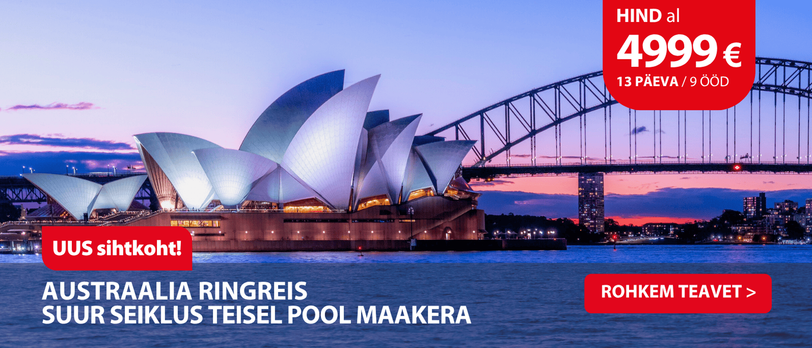 Austraalia on vastandite maa, kus modernsed suurlinnad, troopilised vihmametsad ja suurte ookeanide rannikuelu moodustavad ainulaadse terviku. Selle ringreisi jooksul avastame Melbourne’i, Cairnsi ja Sydney, külastame UNESCO maailmapärandi paiku – Suur Vallrahu, Kuranda vihmamets ja Sinimäed (Blue Mountains) – ning kogeme maailma kuulsat Great Ocean Roadi ja Sydney Ooperimaja. Programm pakub nii looduse väge kui ka elamusi liikumises: sõidame vihmametsade rongiga, hõljume köisraudteel Skyrailiga puulatvade kohal, laskume Scenic Railway’ga maailma kõige järsema mägiraudteega ja ületame orge klaaspõhjaga Scenic Skyway’l. Kohtume koaalade ja kängurudega, jalutame rannaäärsetel promenaadidel ja naudime Austraalia mitmekülgset rütmi.