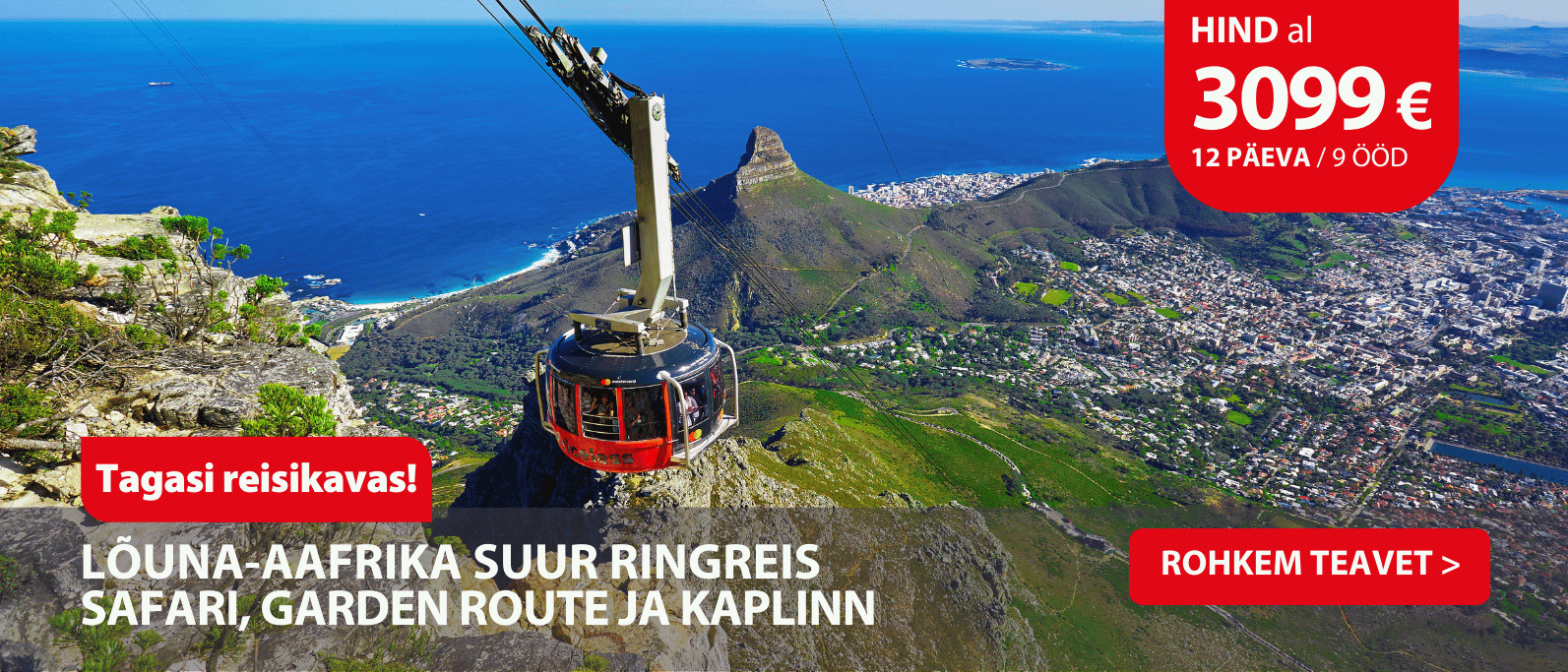 - Ekskursioonipakett: (terve päeva kestev loomade vaatlus Krügeri rahvuspargis, paadikruiis vaalavaatlusega, sõit üles Table Mountainile köisraudteega): 279 €/inimene